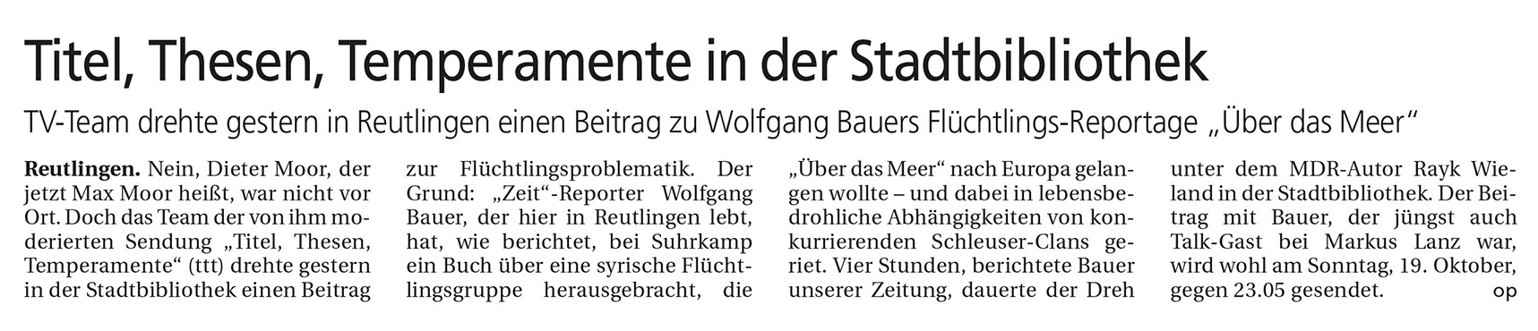 TV-Team drehte gestern in Reutlingen einen Beitrag zu Wolfgang Bauers Flüchtlings-Reportage "Über das Meer" | Reutlinger Nachrichten 16.10.2014