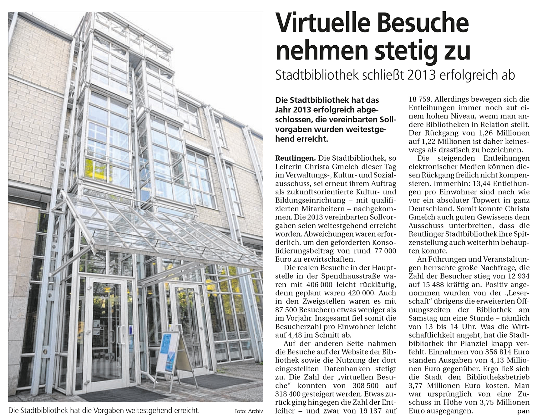 Stadtbibliothek schließt 2013 erfolgreich ab | Reutlinger Nachrichten 12.8.2014