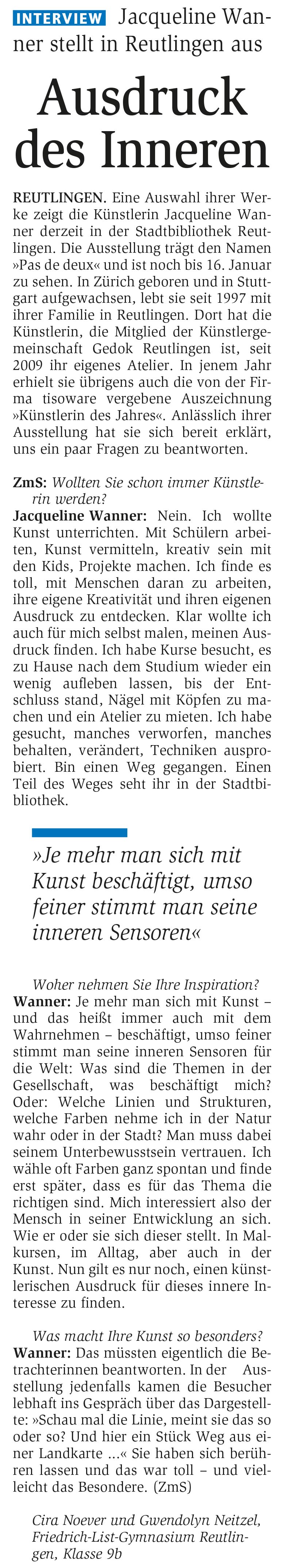 Interview - Jacqueline Wanner stellt in Reutlingen aus | Reutlinger General-Anzeiger www.gea.de 9.12.2015