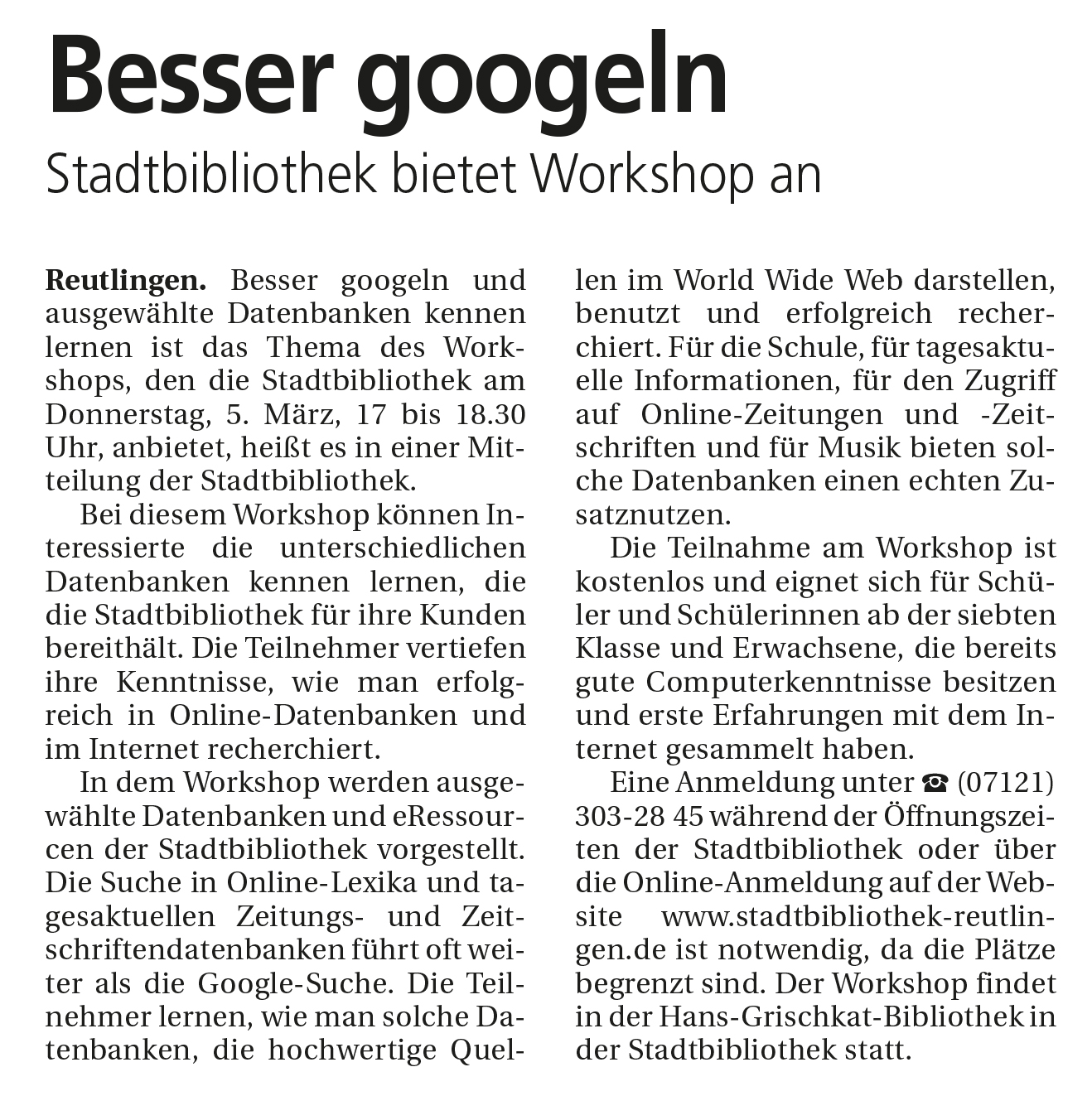 Stadtbibliothek bietet Workshop an | Reutlinger Nachrichten 3.3.2015