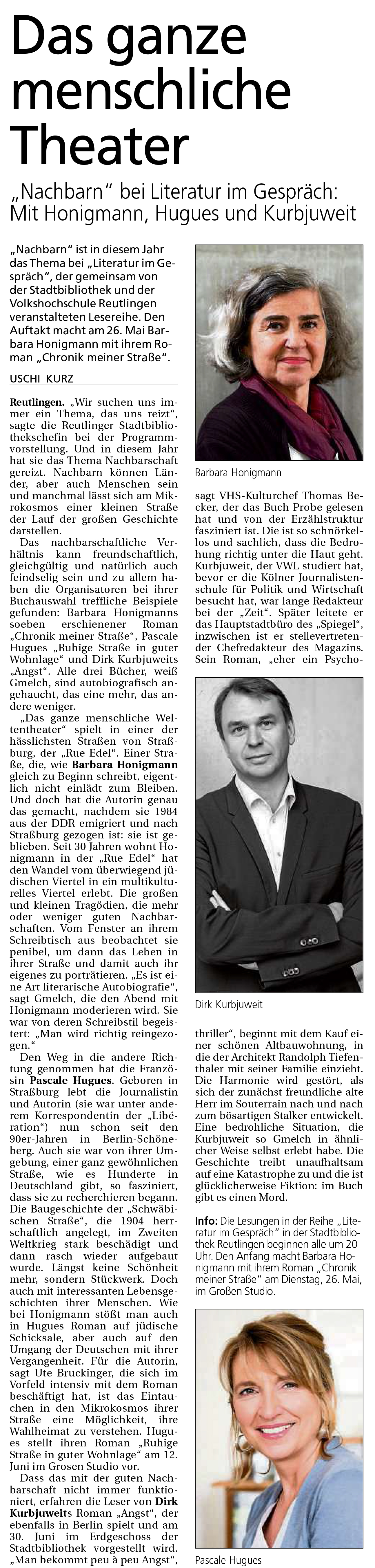"Nachbarn" bei Literatur im Gesräch: Mit Honigmann, Hugues und Kurbjuweit | Schwäbisches Tagblatt 23.5.2015