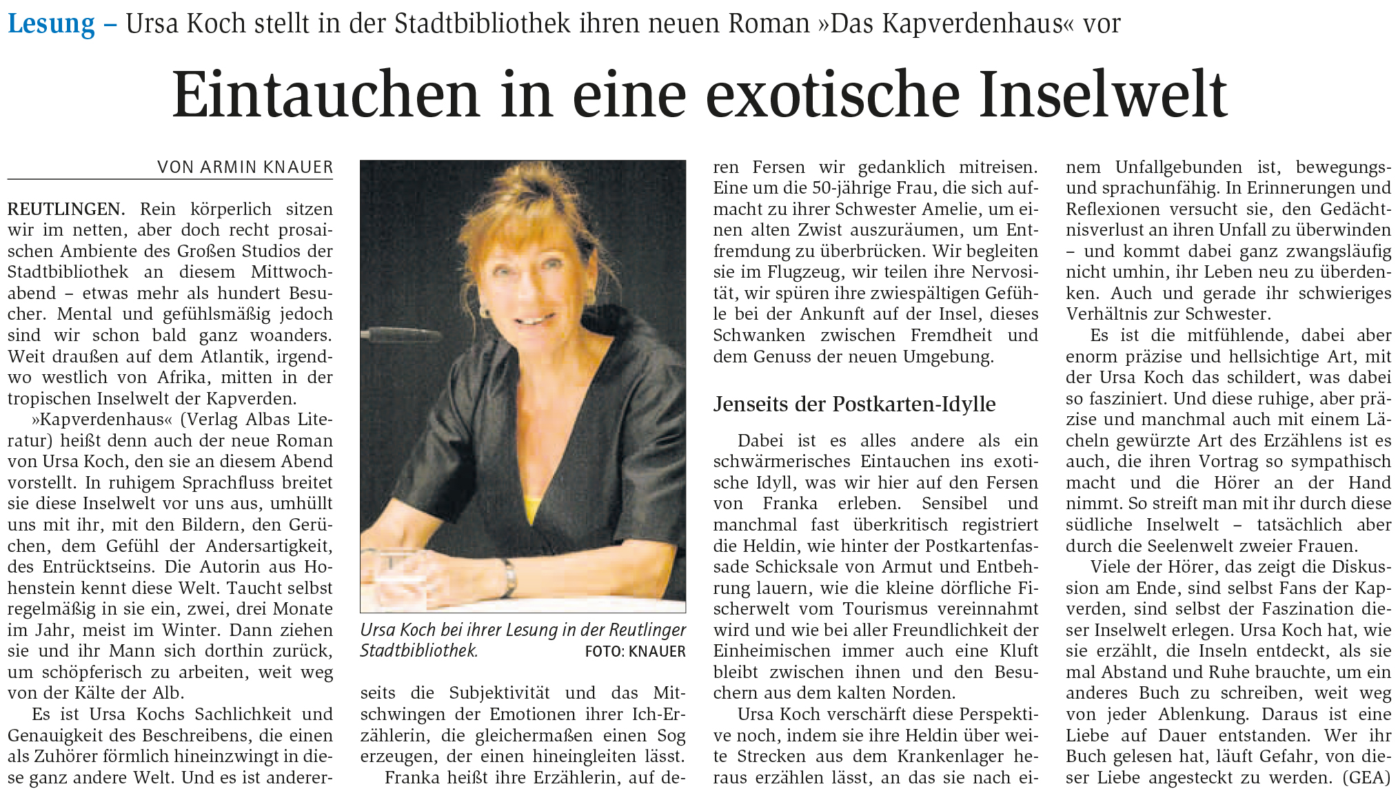 Lesung - Ursa Koch stellt in der Stadtbibliothek ihren neuen Roman "Das Kapverdenhaus" vor | Reutlinger General-Anzeiger www.gea.de 11.9.2015