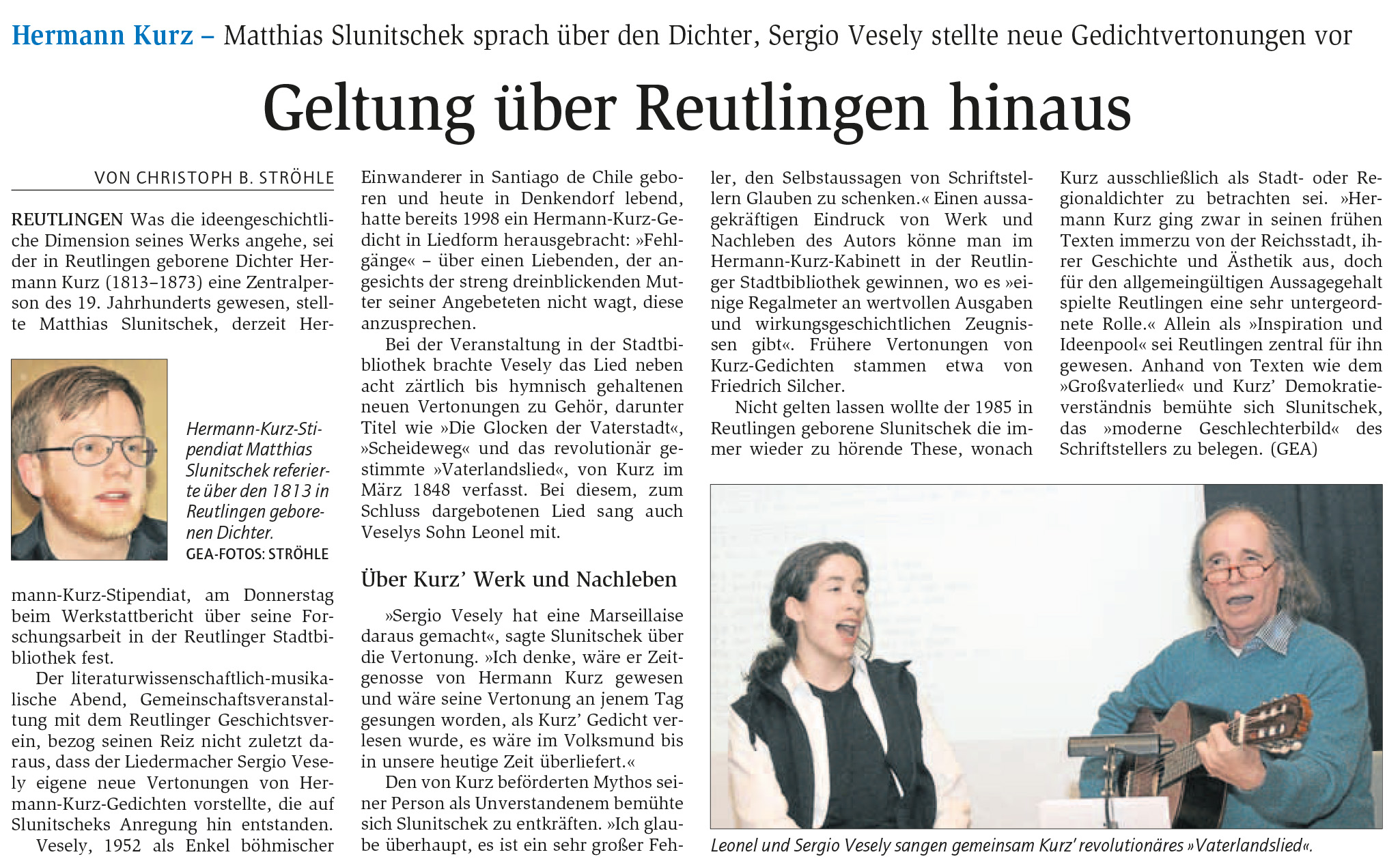 Hermann Kurz - Matthias Slunitschek sprach über den Dichter, Sergio Vesely stellte neue Gedichtvertonungen vor | Reutlinger General-Anzeiger www.gea.de 14.2.2015