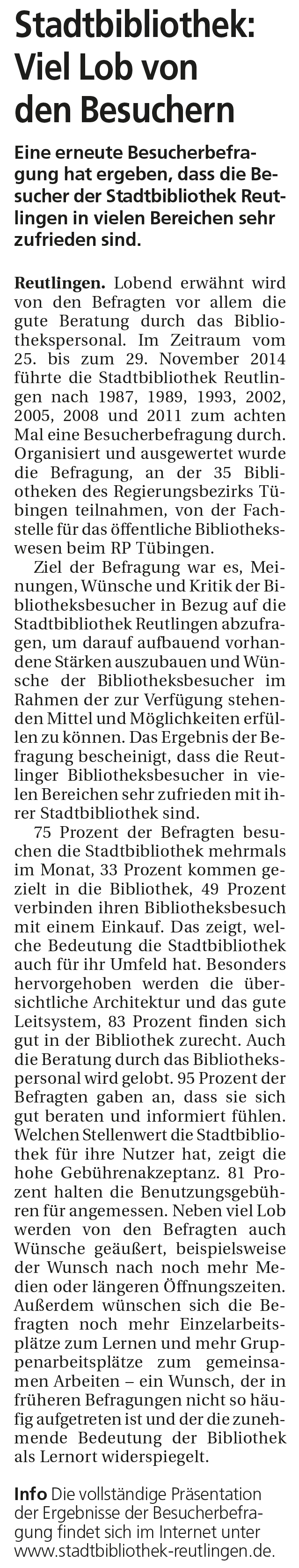 Sie sind hier: Startseite / Über uns / Presse / 2015 / Stadtbibliothek: Viel Lob von den Besuchern
