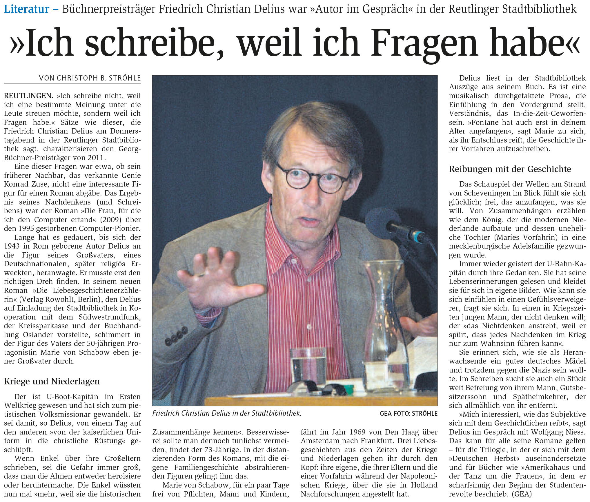 Literatur - Büchnerpreisträger Friedrich Christian Delius war "Autor im Gespräch" in der Reutlinger Stadtbibliothek | Reutlinger General-Anzeiger www.gea.de 4.6.2016