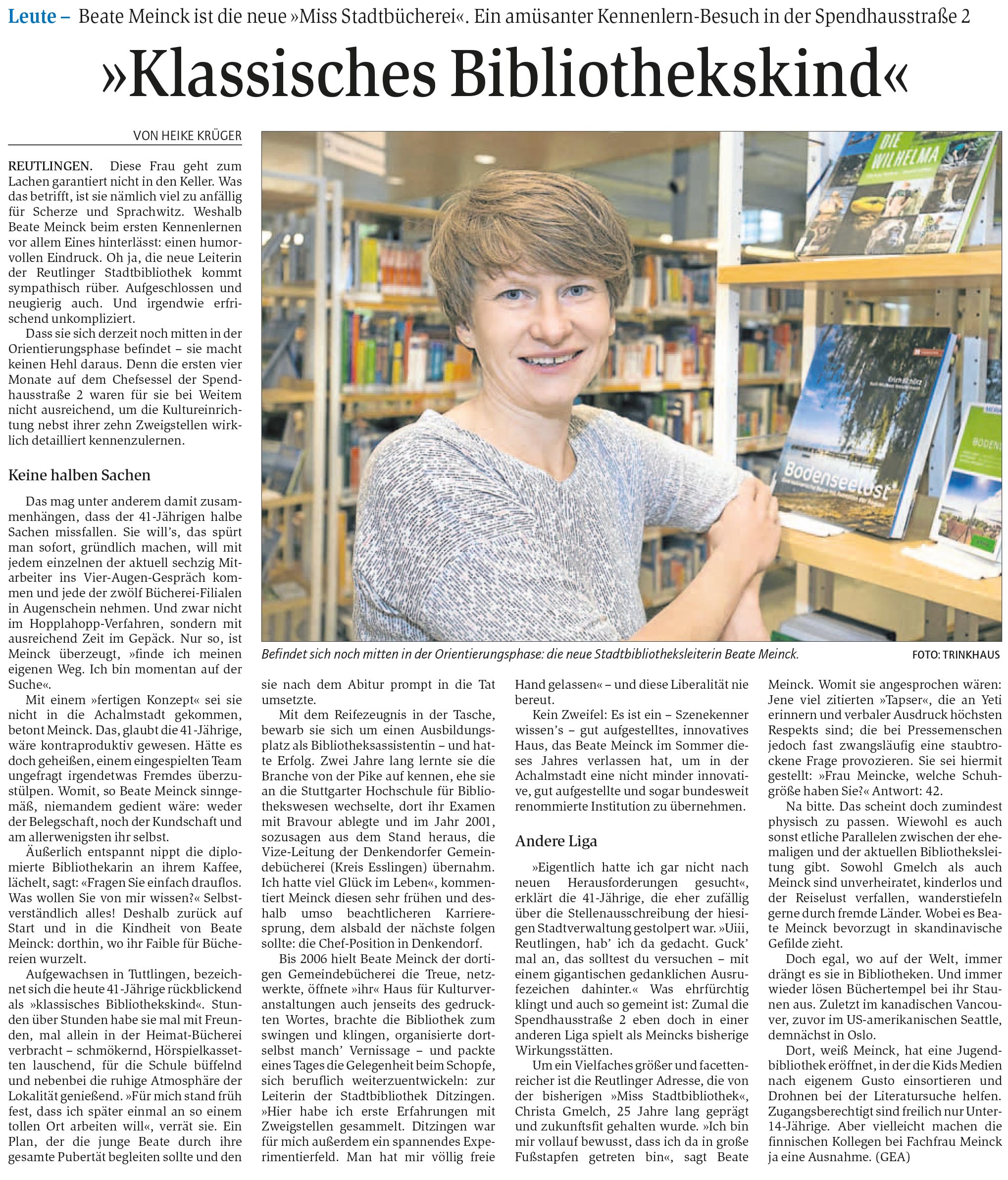Leute - Beate Meinck ist die neue "Miss Stadtbücherei". Ein amüsanter Kennenlern-Besuch in der Spendhausstraße 2 | Reutlinger General-Anzeiger www.gea.de 8.10.2016