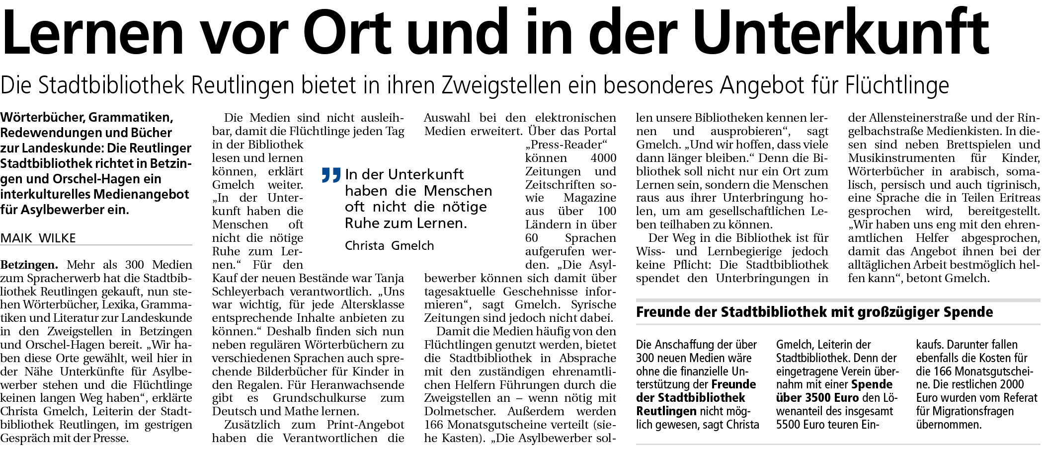 Die Stadtbibliothek Reutlingen bietet in ihren Zweigstellen ein besonderes Angebot für Füchtlinge | Schwäbisches Tagblatt 15.1.2016