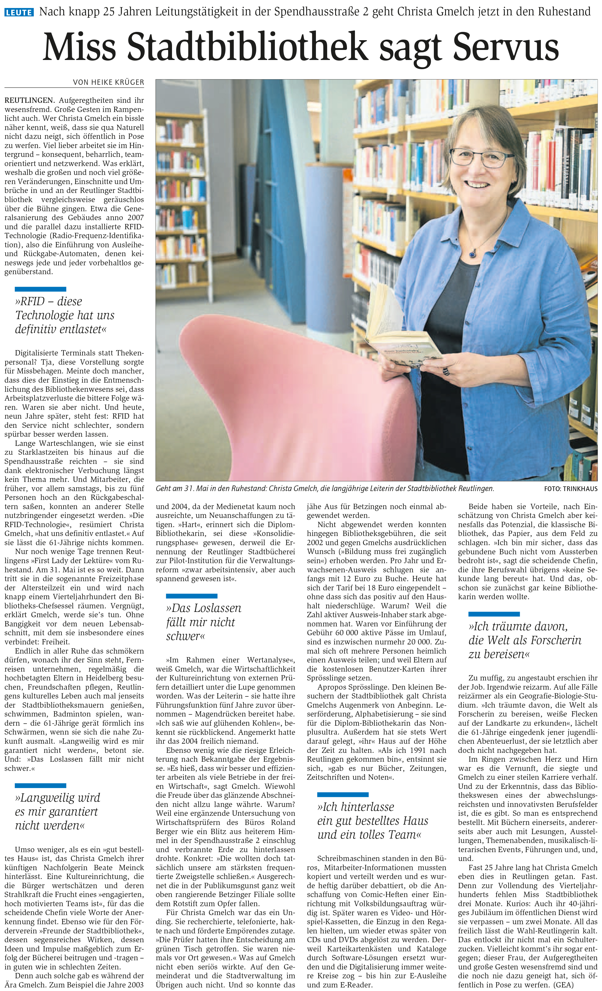 Nach knapp 25 Jahren Leitungstätigkeit in der Spendhausstraße 2 geht Christa Gmelch jetzt in den Ruhestand | Reutlinger General-Anzeiger www.gea.de 28.5.2016