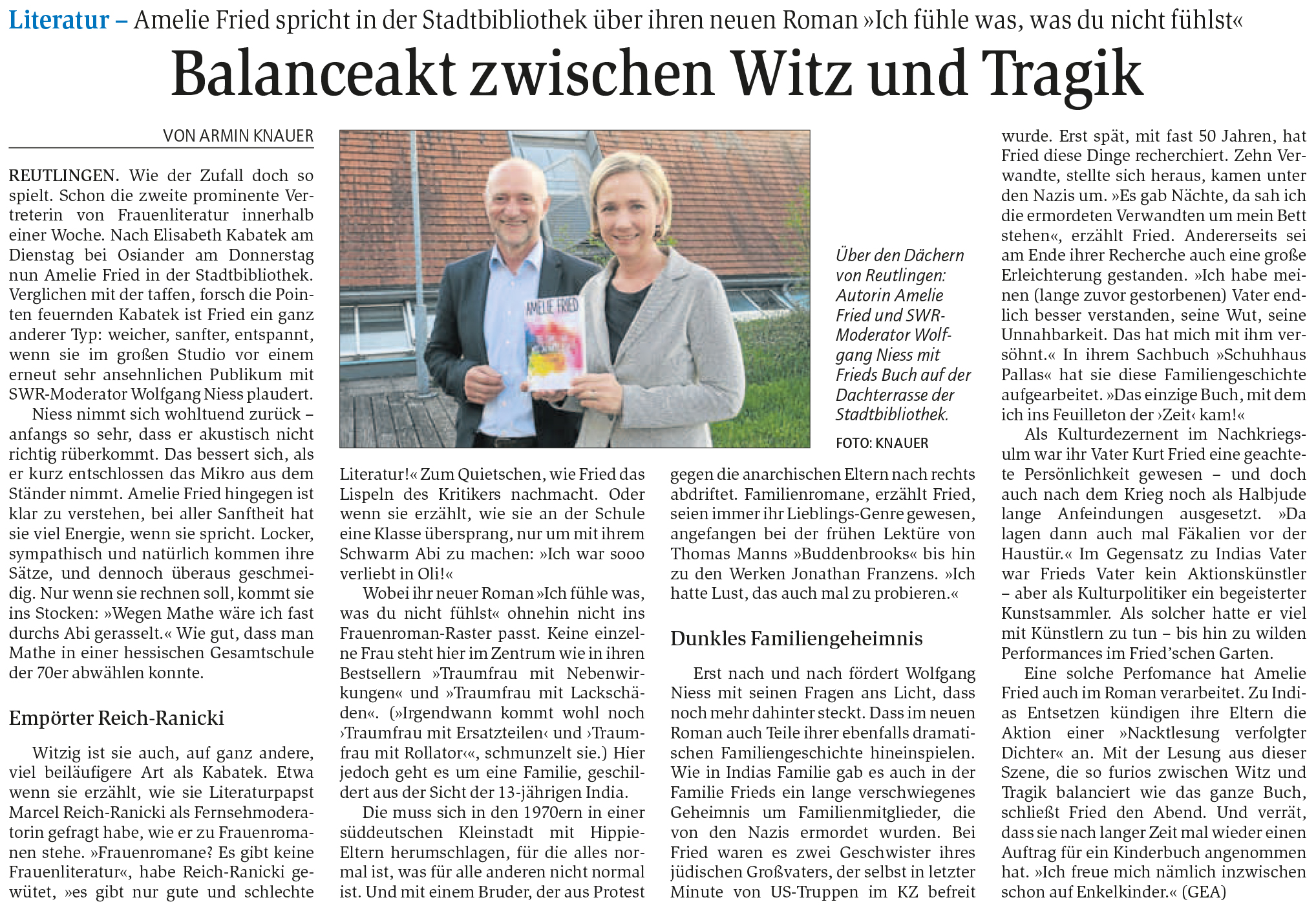 Literatur - Amelie Fried spricht in der Stadtbibliothek über ihren neuen Roman "Ich fühle was, was du nicht fühlst" | Reutlinger General-Anzeiger www.gea.de 1.4.2017