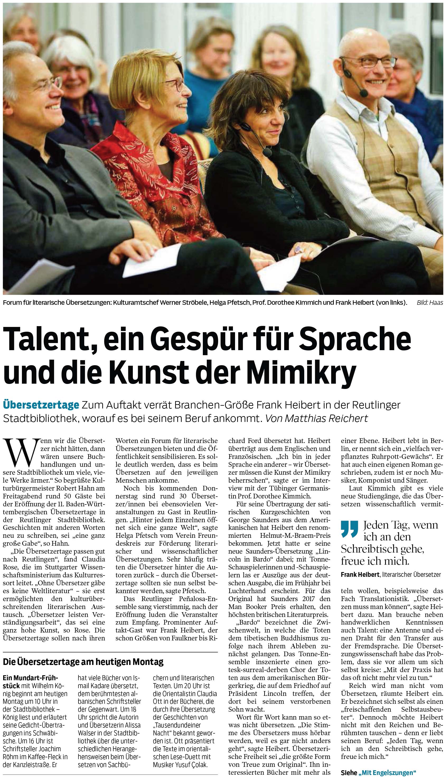Übersetzertage - Zum Auftakt verrät Branchen-Größe Frank Heibert in der Reutlinger Stadtbibliothek, worauf es bei seinem Beruf ankommt. | Schwäbisches Tagblatt 13.11.2017