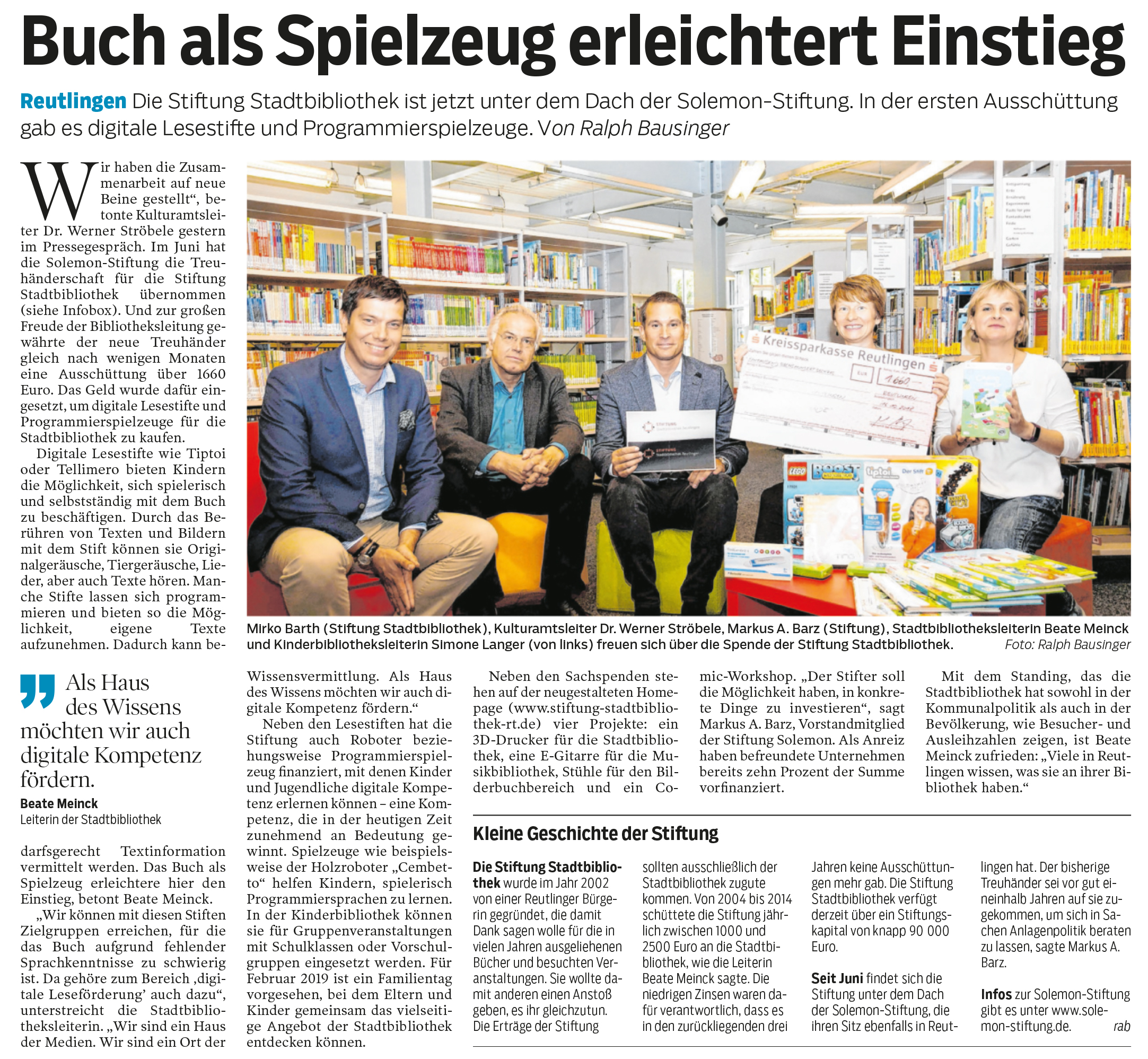 Reutlingen - Die Stiftung Stadtbibliothek ist jetzt unter dem Dach der Solemon-Stiftung. In der ersten Ausschüttung