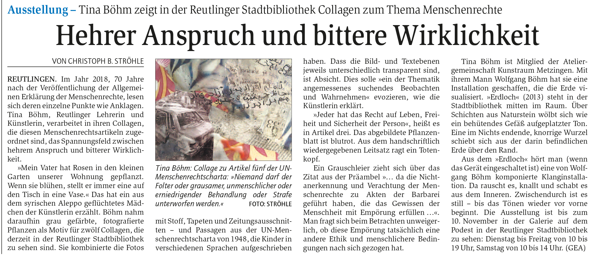 Ausstellung - Tina Böhm zeigt in der Reutlinger Stadtbibliothek Collagen zum Thema Menschenrechte | Reutlinger General-Anzeiger www.gea.de 27.9.2018