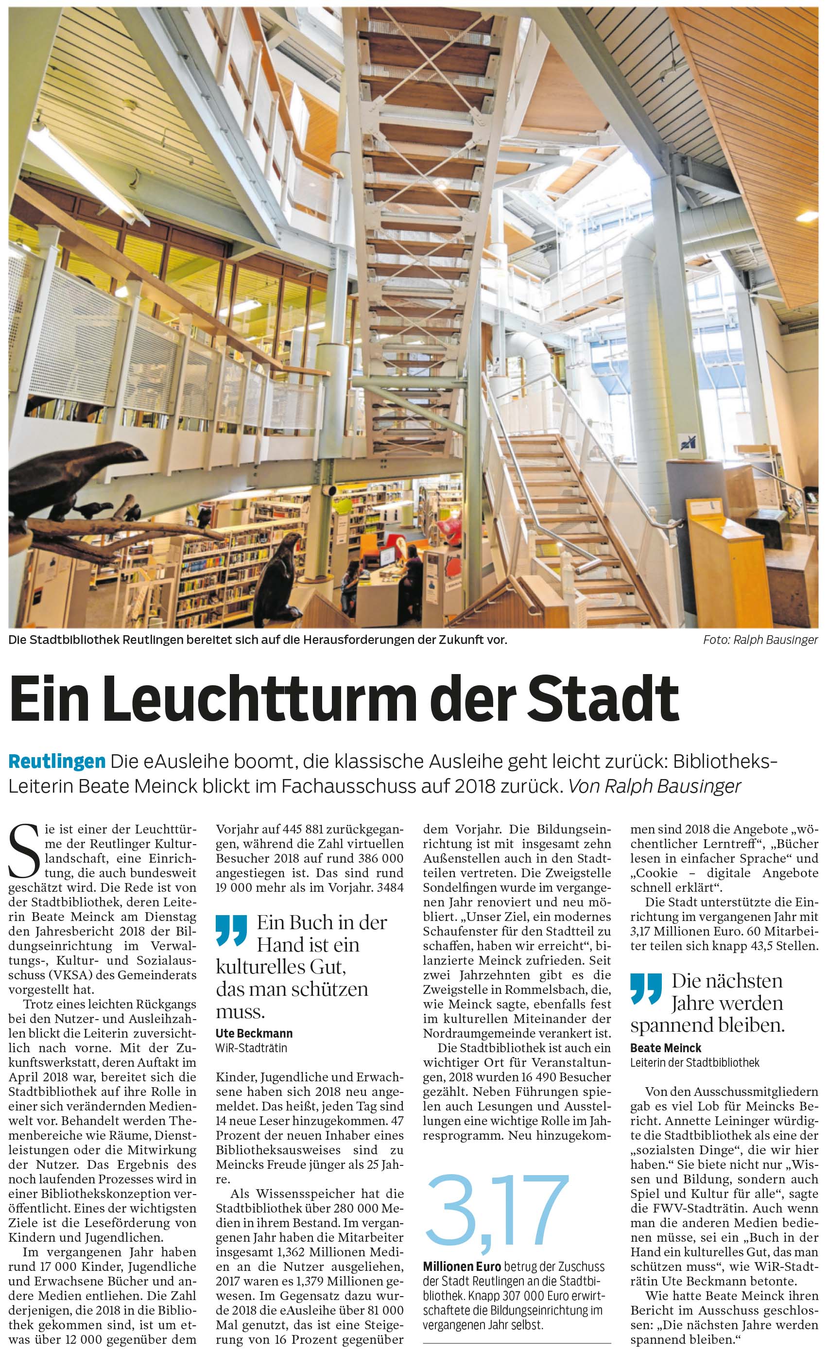 Reutlingen - Die eAusleihe boomt, die klassische Ausleihe geht leicht zurück: Bibliotheks- Leiterin Beate Meinck blickt im Fachausschuss auf 2018 zurück. | Reutlinger Nachrichten 18.7.2019