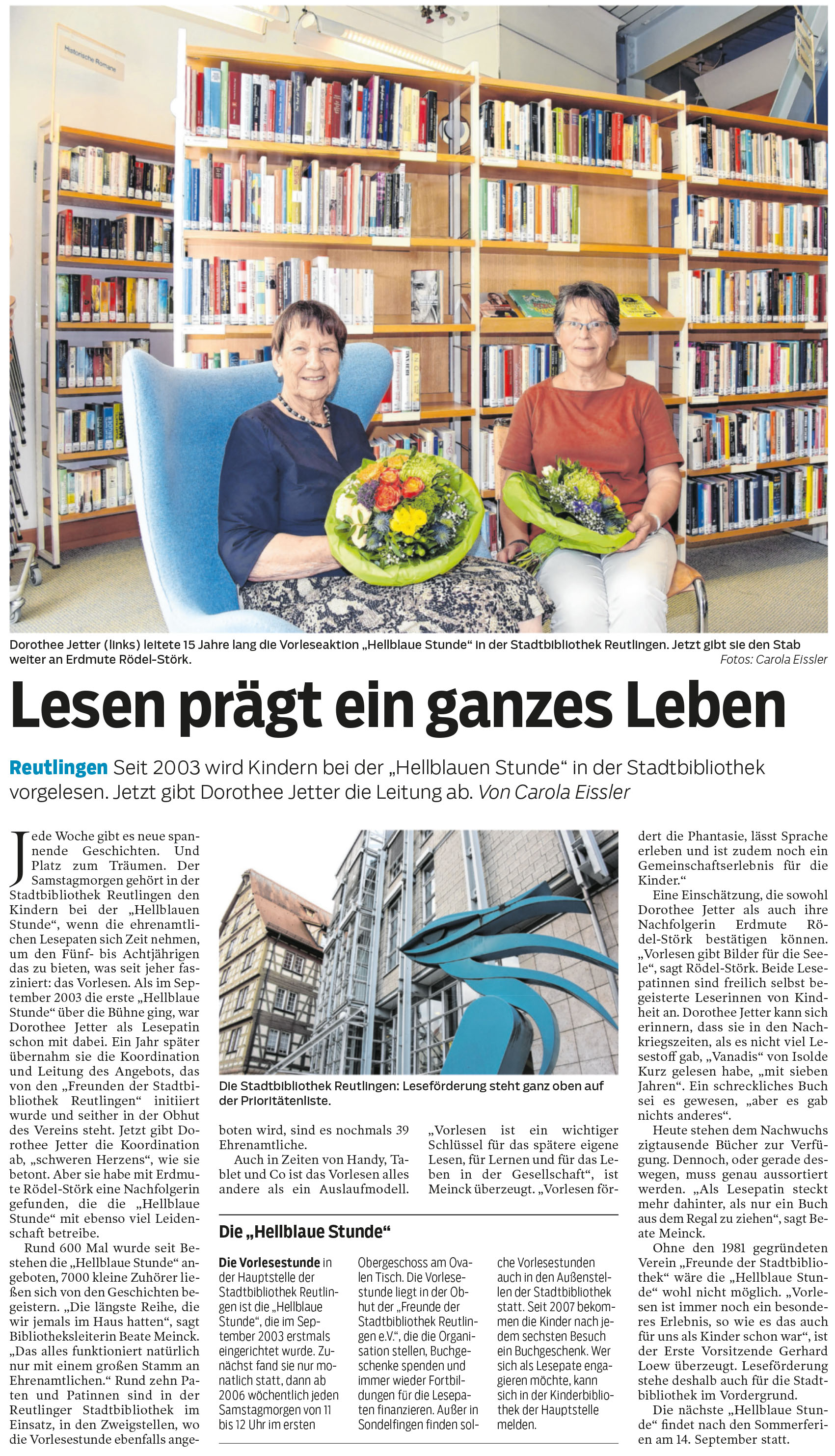 Seit 2003 wird Kindern bei der „Hellblauen Stunde“ in der Stadtbibliothek vorgelesen. Jetzt gibt Dorothee Jetter die Leitung ab. | Reutlinger Nachrichten 1.8.2019