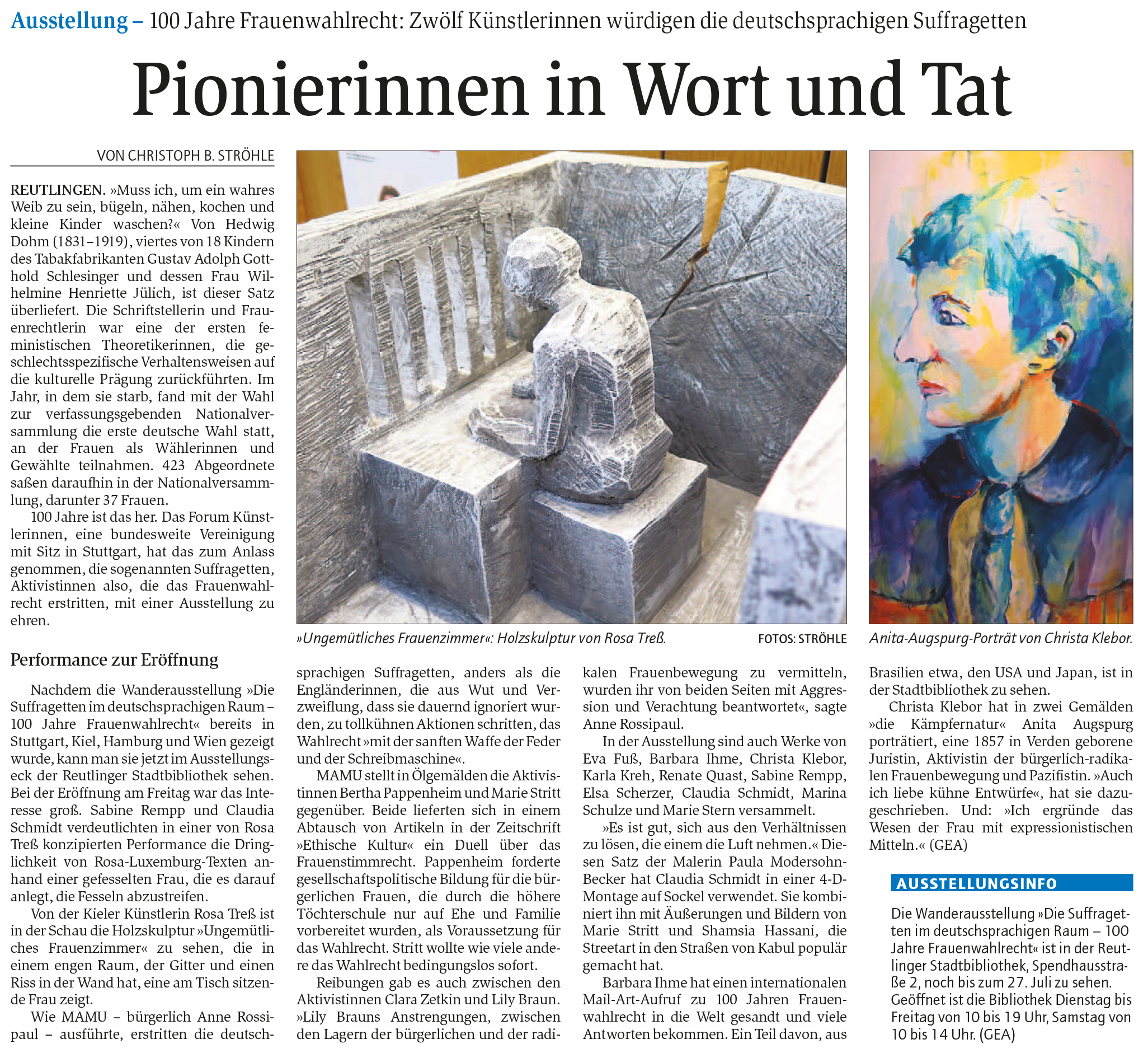Ausstellung - 100 Jahre Frauenwahlrecht: Zwölf Künstlerinnen würdigen die deutschsprachigen Suffragetten | Reutlinger General-Anzeiger www.gea.de 3.6.2019